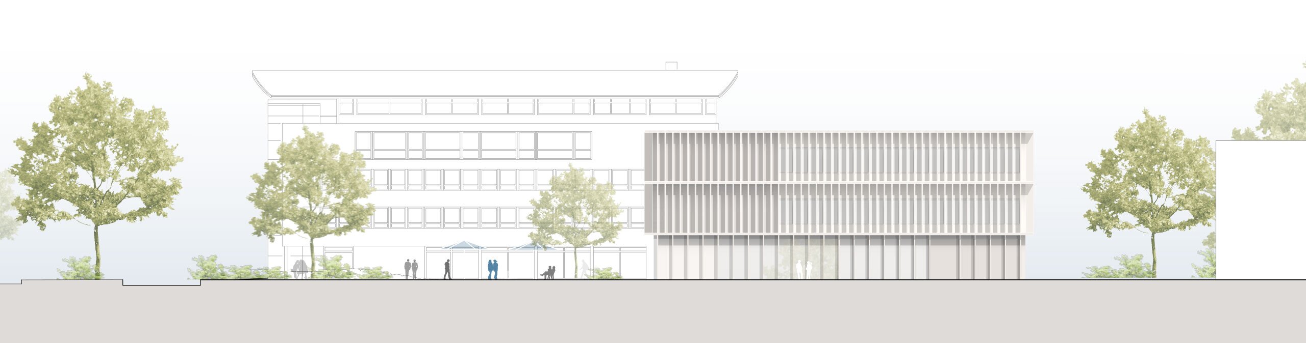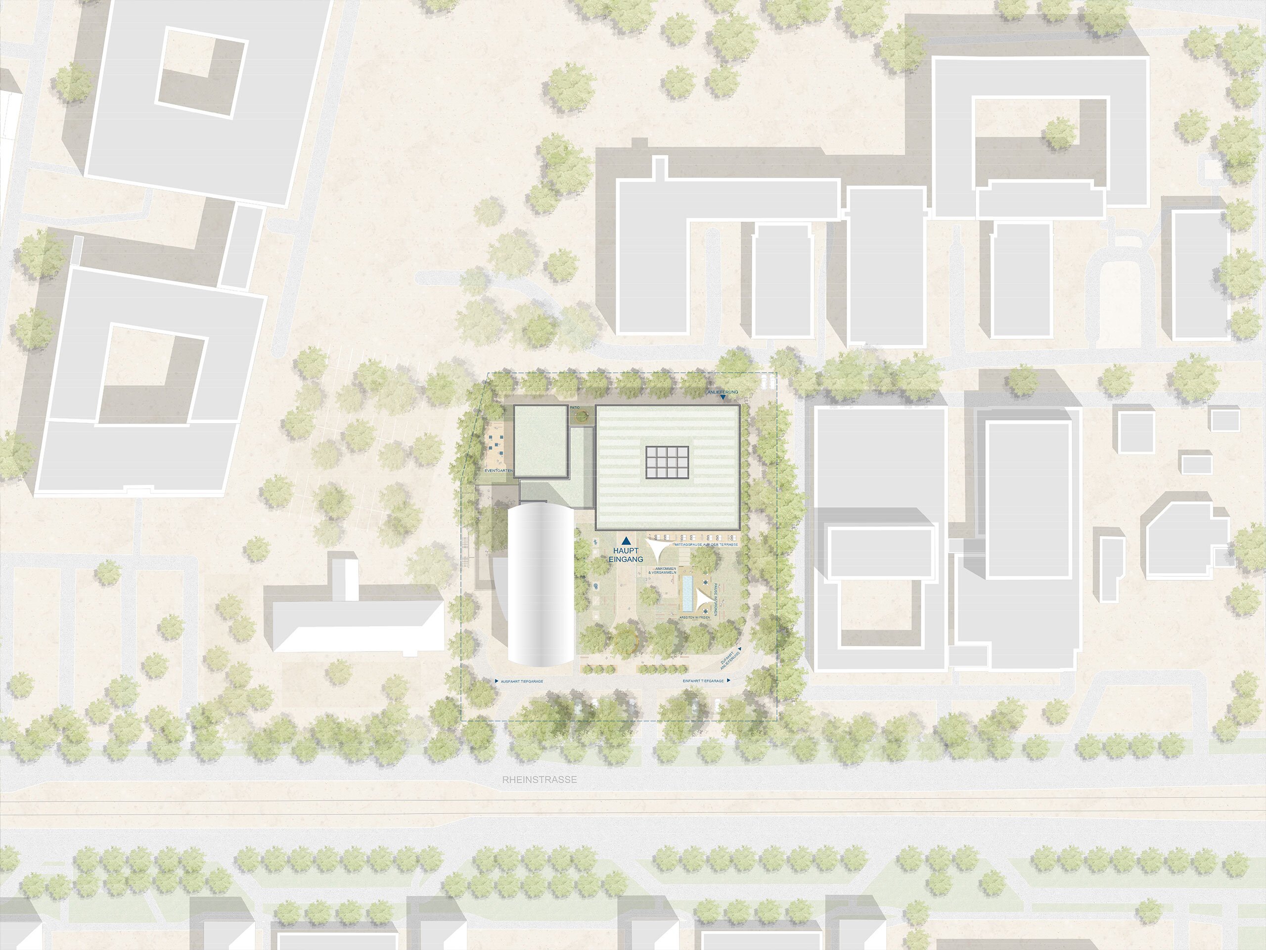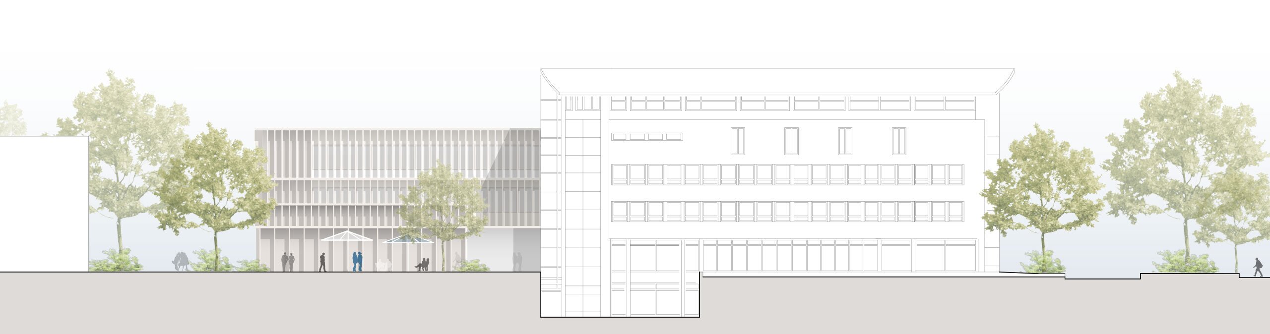 Das Gebäude positioniert sich als eigenständiger, klar adressierter Solitär innerhalb der bestehenden Grünstruktur des IHK-Areals. Durch seine freistehende Setzung entsteht ein prägnantes Erscheinungsbild, das die Verbindung zwischen Bestand und Außenraum stärkt und eine Einladung an die Stadtgesellschaft formuliert. Die weitgehend transparente Erdgeschosszone lässt die Grenzen zwischen Innen und Außen bewusst verschwimmen und vermittelt Offenheit sowie Dialogbereitschaft nach außen.