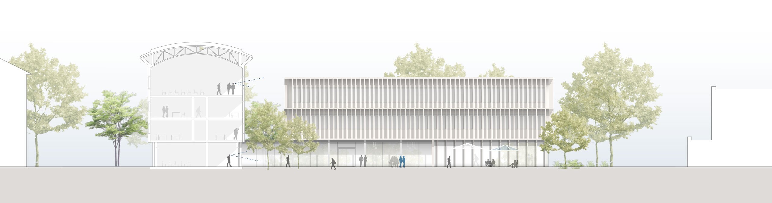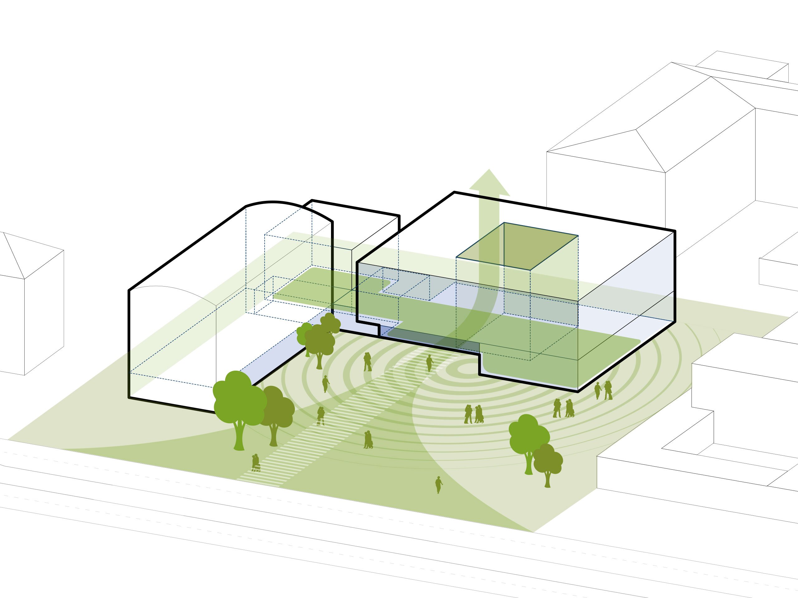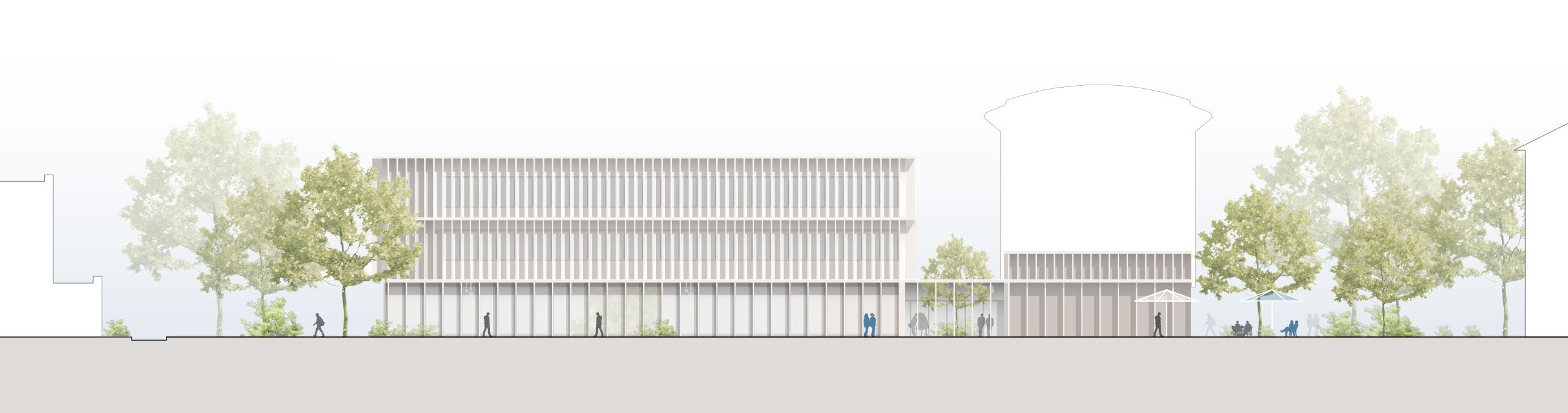 Das Gebäude positioniert sich als eigenständiger, klar adressierter Solitär innerhalb der bestehenden Grünstruktur des IHK-Areals. Durch seine freistehende Setzung entsteht ein prägnantes Erscheinungsbild, das die Verbindung zwischen Bestand und Außenraum stärkt und eine Einladung an die Stadtgesellschaft formuliert. Die weitgehend transparente Erdgeschosszone lässt die Grenzen zwischen Innen und Außen bewusst verschwimmen und vermittelt Offenheit sowie Dialogbereitschaft nach außen.