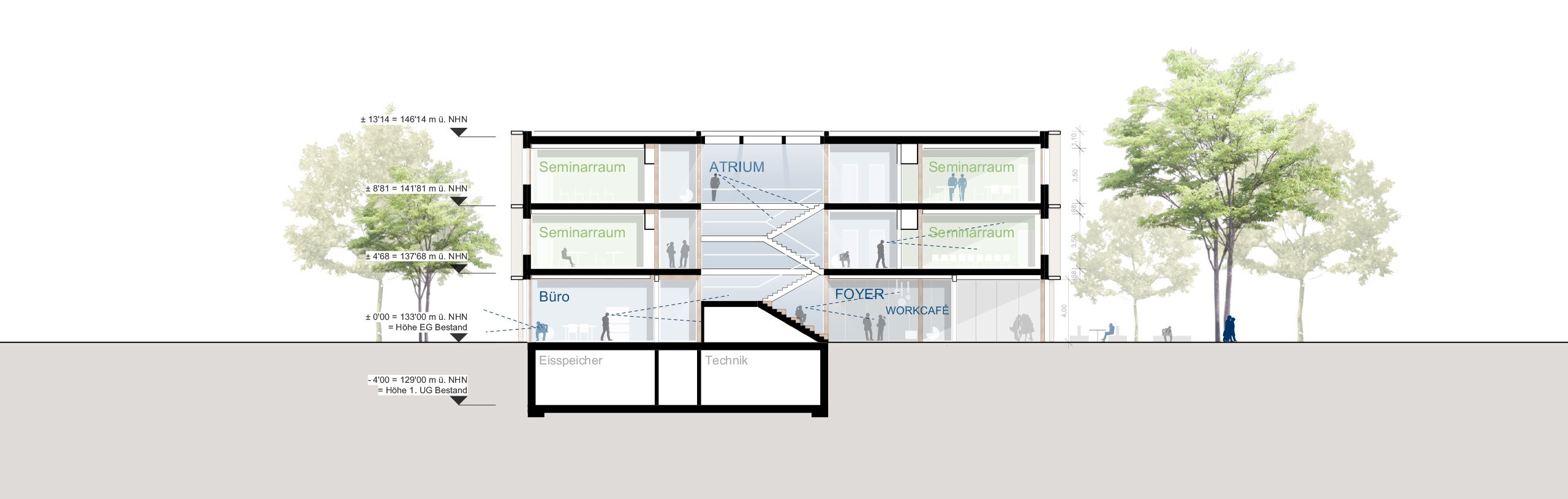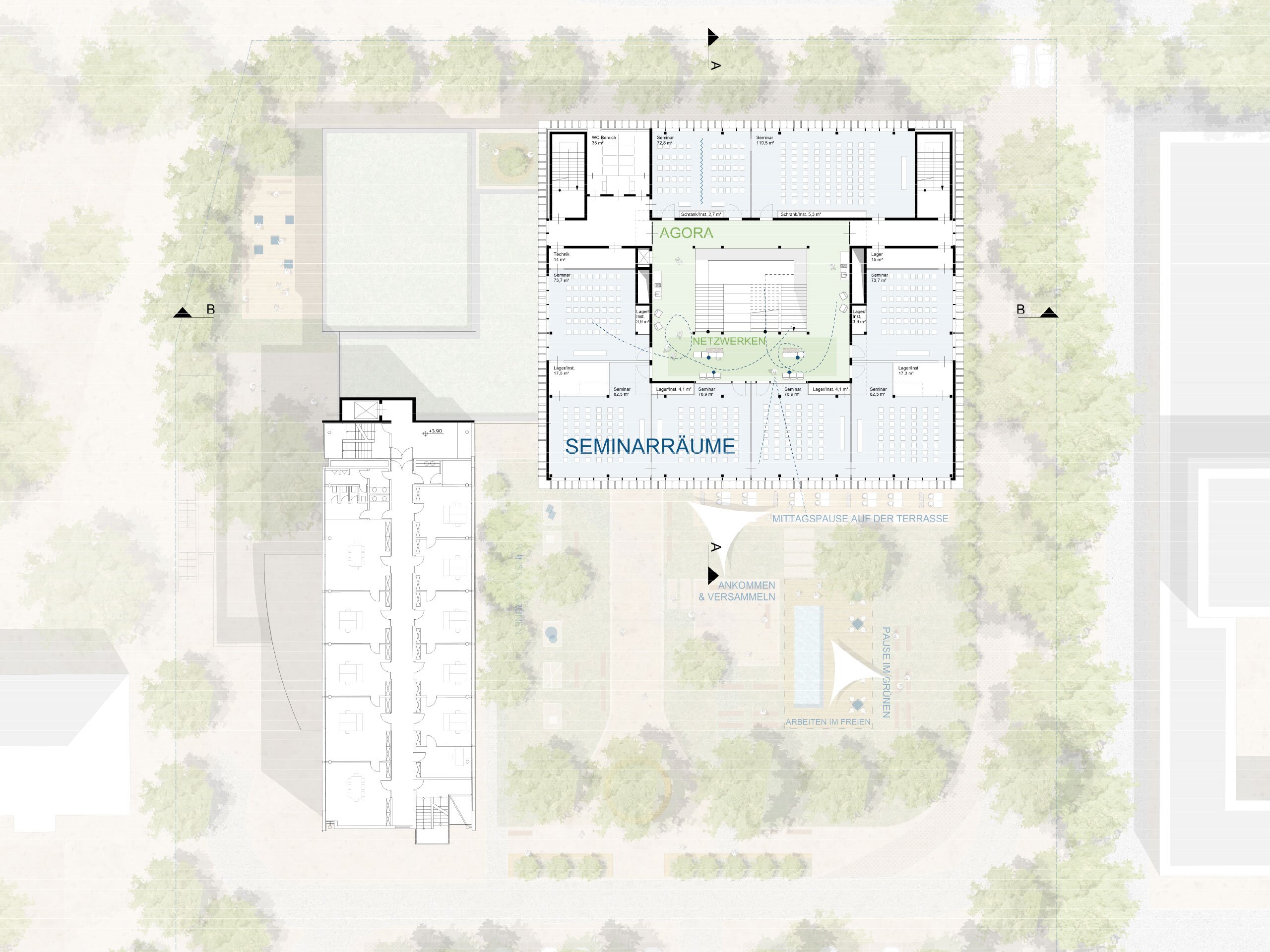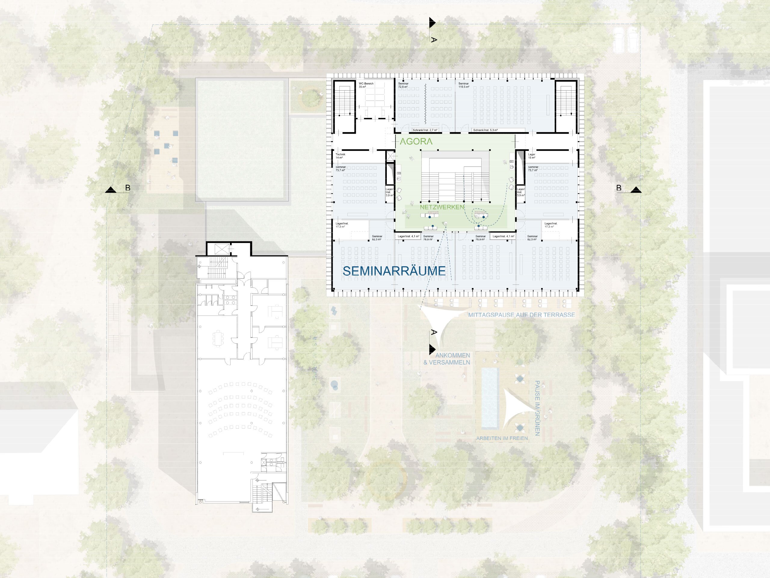 Die Grundrissorganisation folgt einer klaren Clusterstruktur. Thematisch zusammengehörige Bereiche sind funktional sinnvoll gruppiert und räumlich miteinander vernetzt. In den Obergeschossen befinden sich die Seminar- und Schulungsräume, ergänzt durch vorgelagerte Kommunikationszonen, die den informellen Austausch fördern und die Identität des Hauses als Ort der Begegnung stärken. Sämtliche Ebenen sind barrierefrei erschlossen.