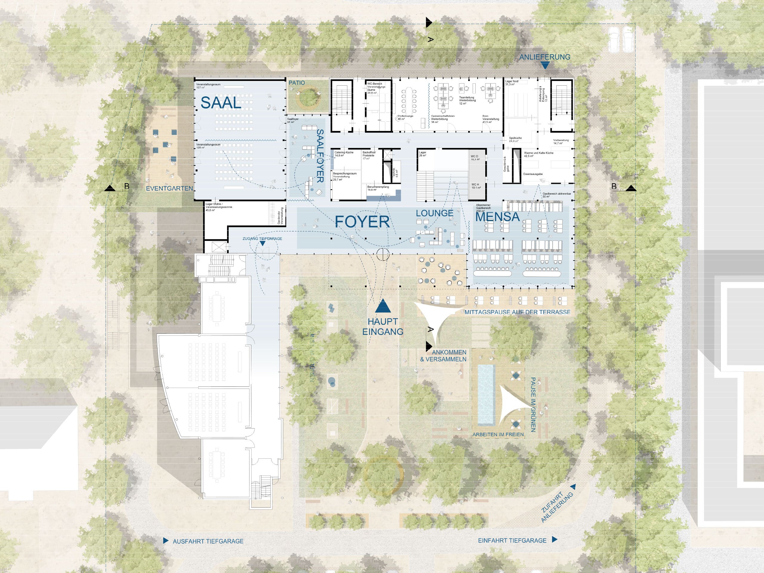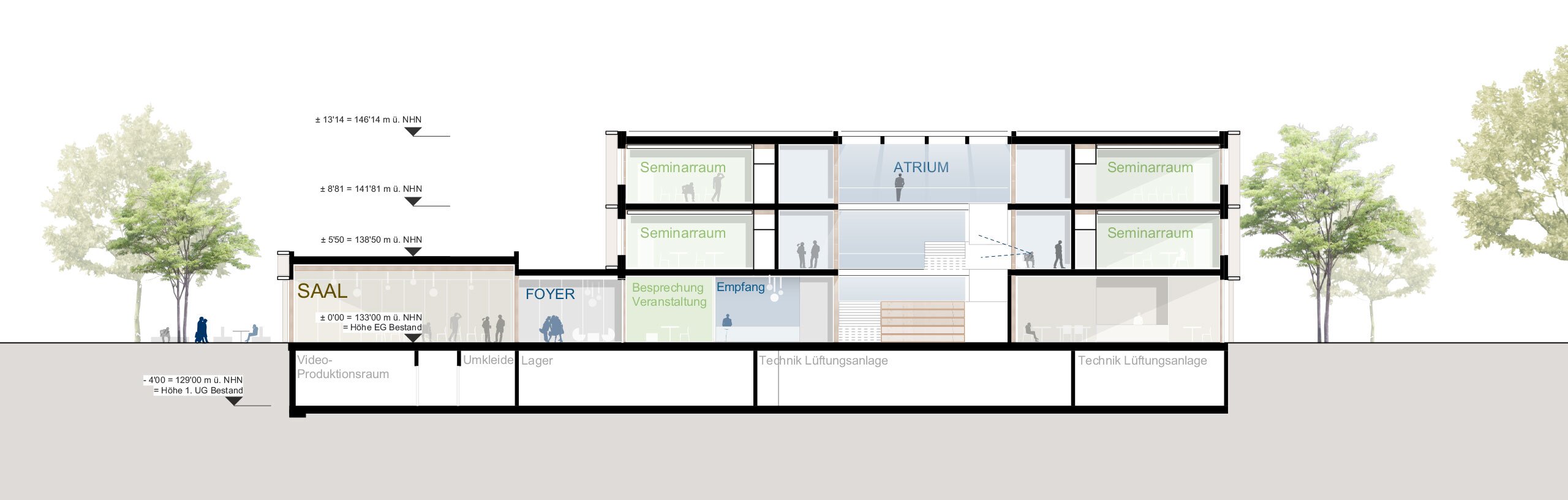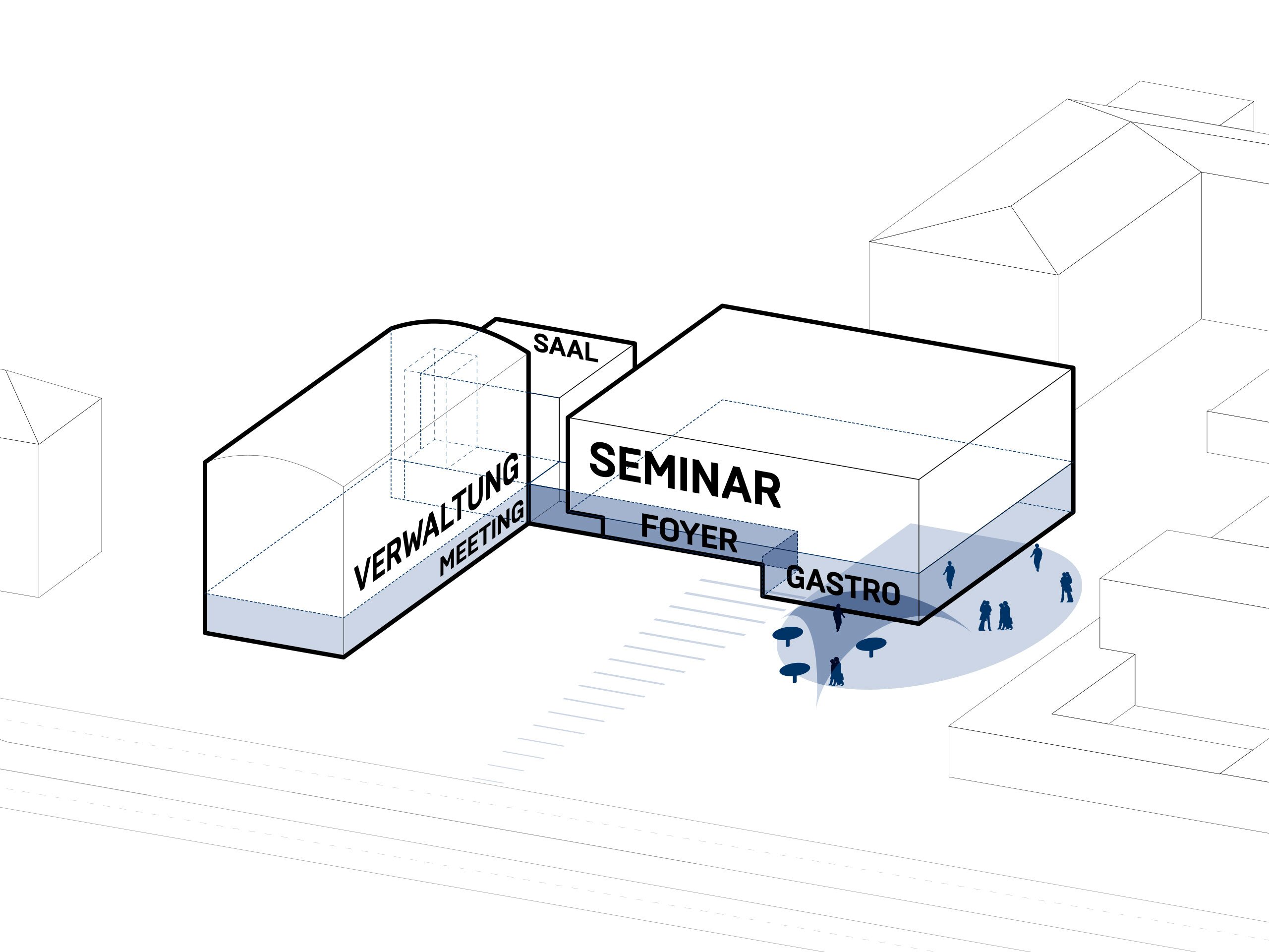 Die Grundrissorganisation folgt einer klaren Clusterstruktur. Thematisch zusammengehörige Bereiche sind funktional sinnvoll gruppiert und räumlich miteinander vernetzt. In den Obergeschossen befinden sich die Seminar- und Schulungsräume, ergänzt durch vorgelagerte Kommunikationszonen, die den informellen Austausch fördern und die Identität des Hauses als Ort der Begegnung stärken. Sämtliche Ebenen sind barrierefrei erschlossen.