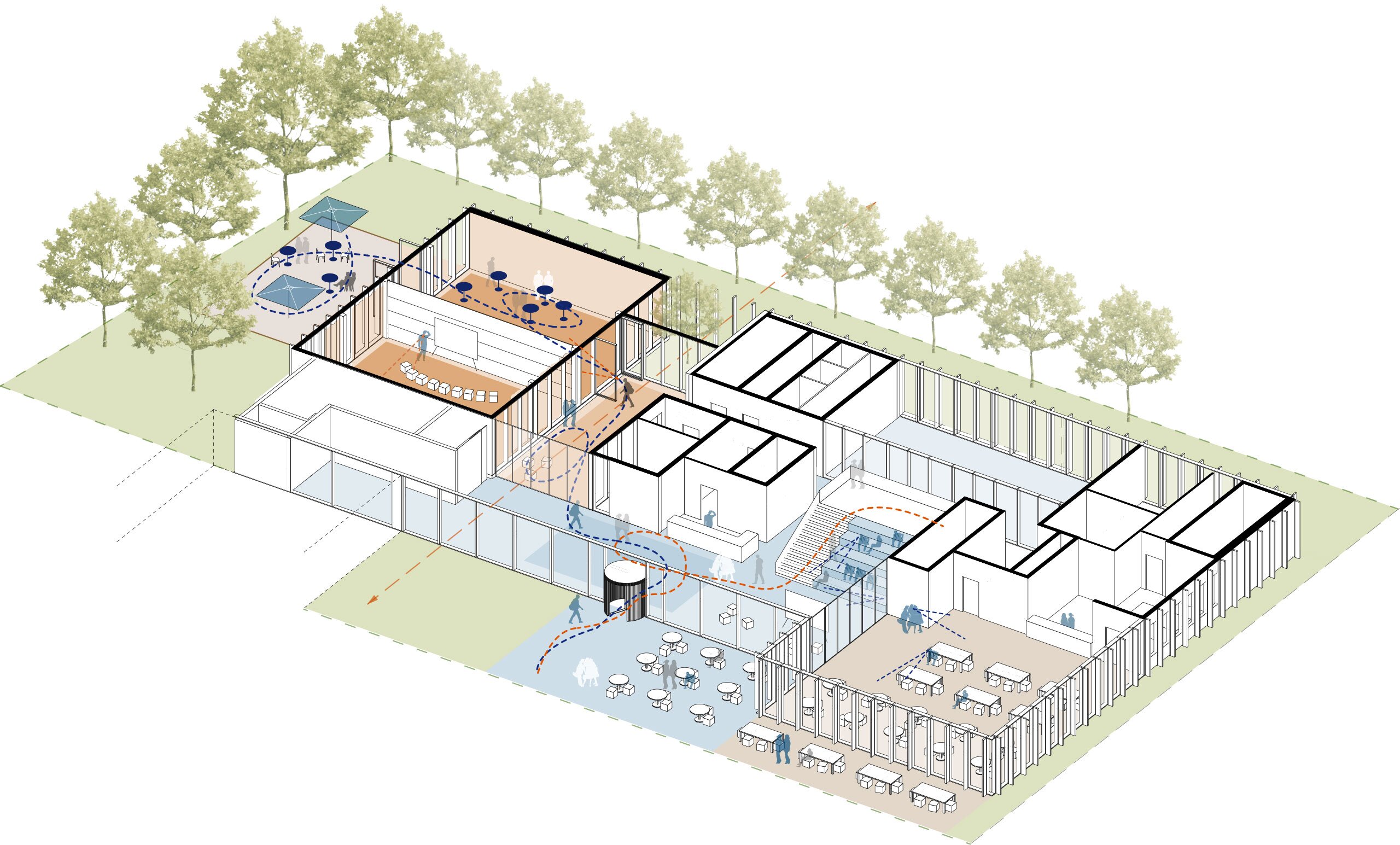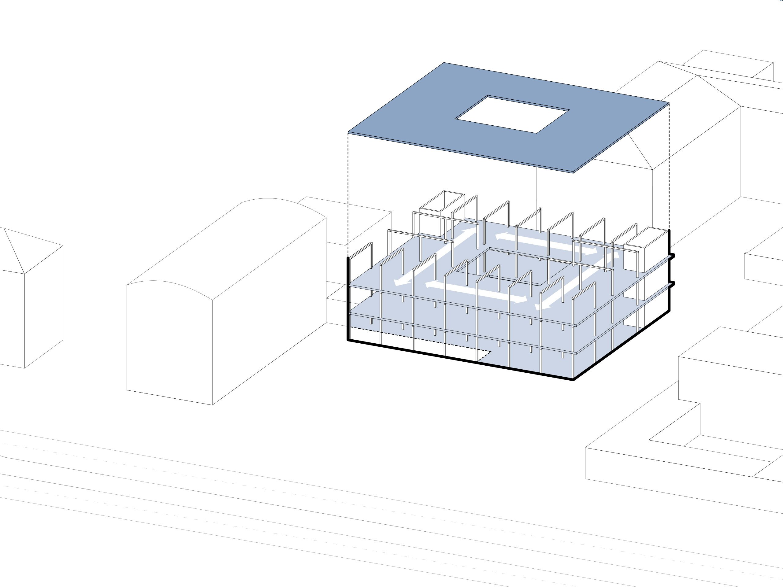 Das Nachhaltigkeits- und Energiekonzept folgt einem bewusst einfachen Low-Tech-Ansatz. Eine optimierte Gebäudehülle, begrünte Dachflächen sowie eine langlebige, wartungsarme Konstruktion bilden die Grundlage für einen effizienten und ressourcenschonenden Betrieb. Architektur und Struktur übernehmen dabei einen wesentlichen Teil der funktionalen und klimatischen Qualitäten des Gebäudes.