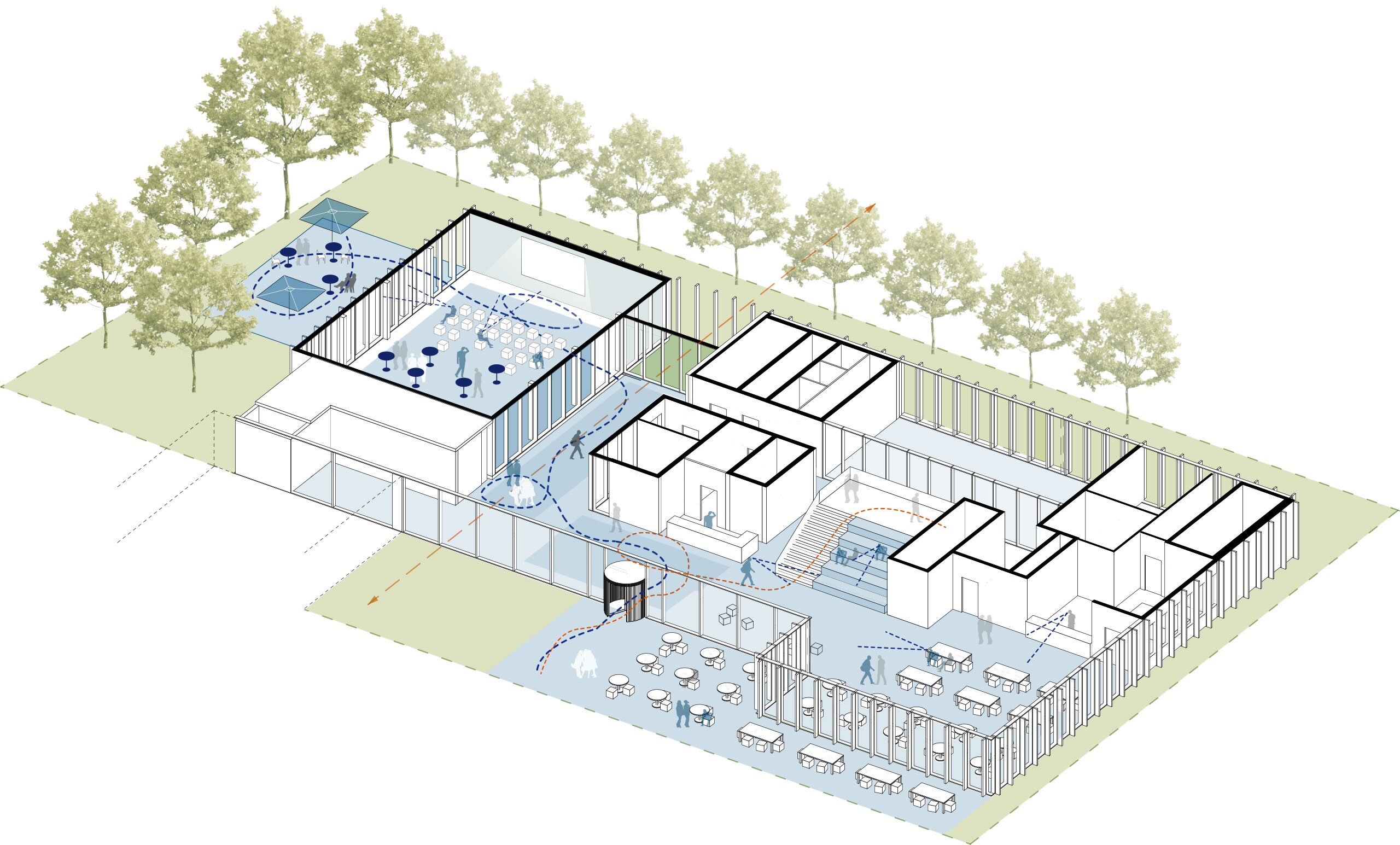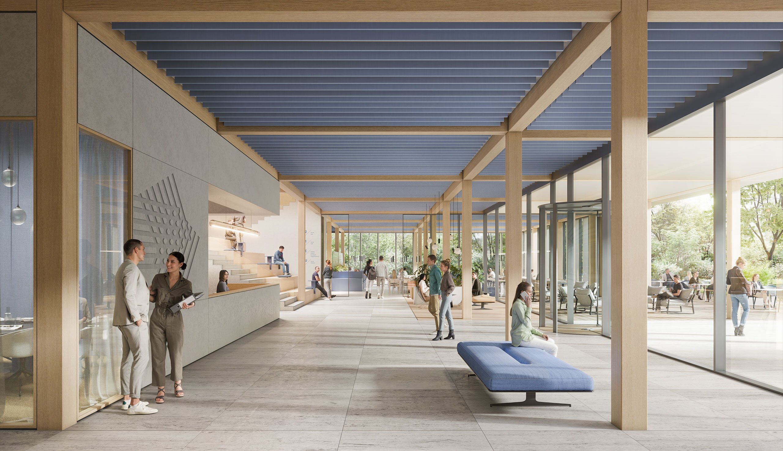 Im Inneren bildet das Erdgeschoss das kommunikative Zentrum des Hauses. Foyer, Veranstaltungsbereiche und Gastronomie sind zu einem offenen, flexibel nutzbaren Raumgefüge verbunden, das sowohl den täglichen Betrieb als auch die unabhängige Nutzung für Veranstaltungen und Abendformate ermöglicht. Eine zentrale Sitzstufenanlage entwickelt sich hier zur Agora des Hauses und dient gleichermaßen dem Aufenthalt, dem Austausch sowie Vorträgen und Veranstaltungen.