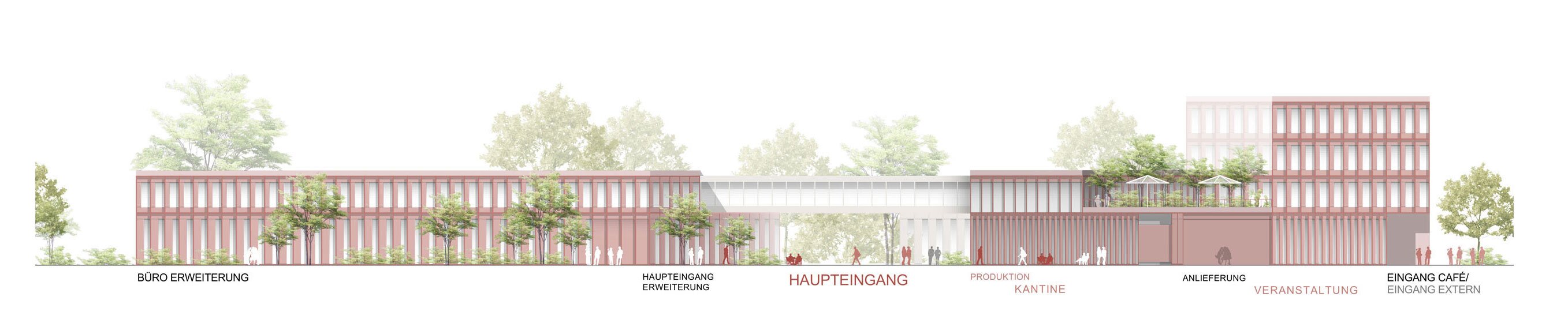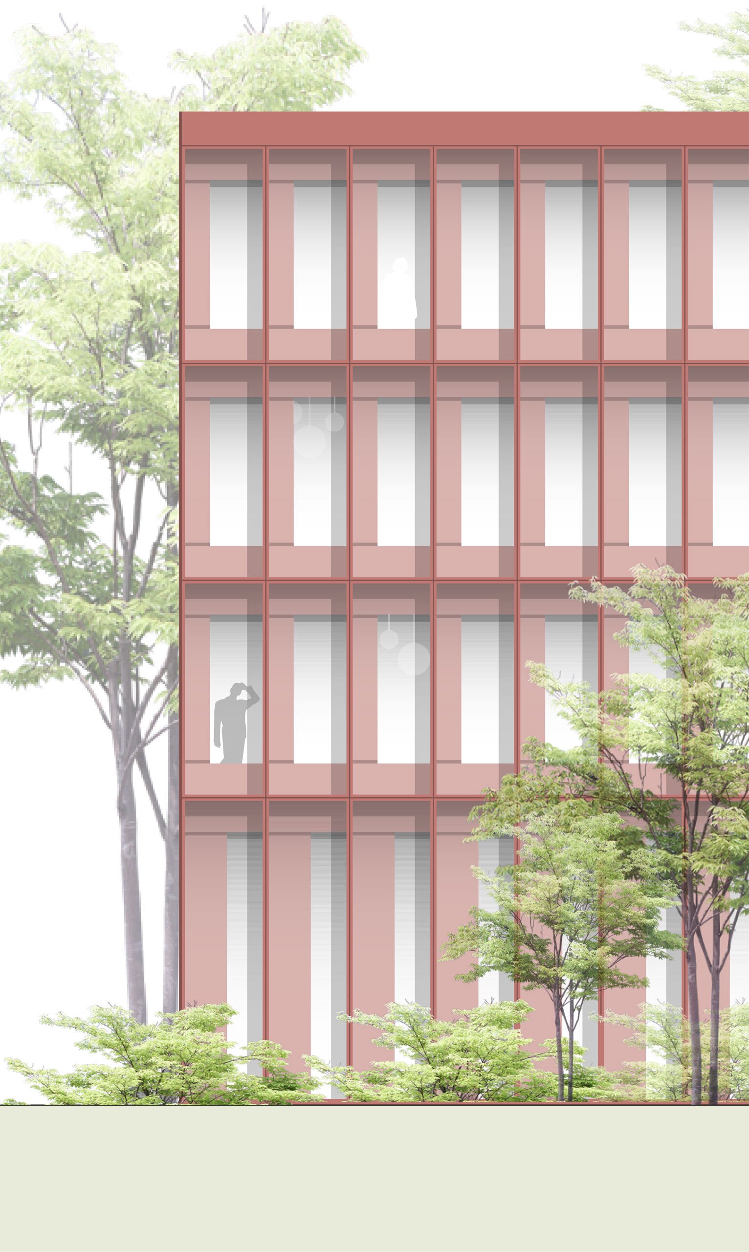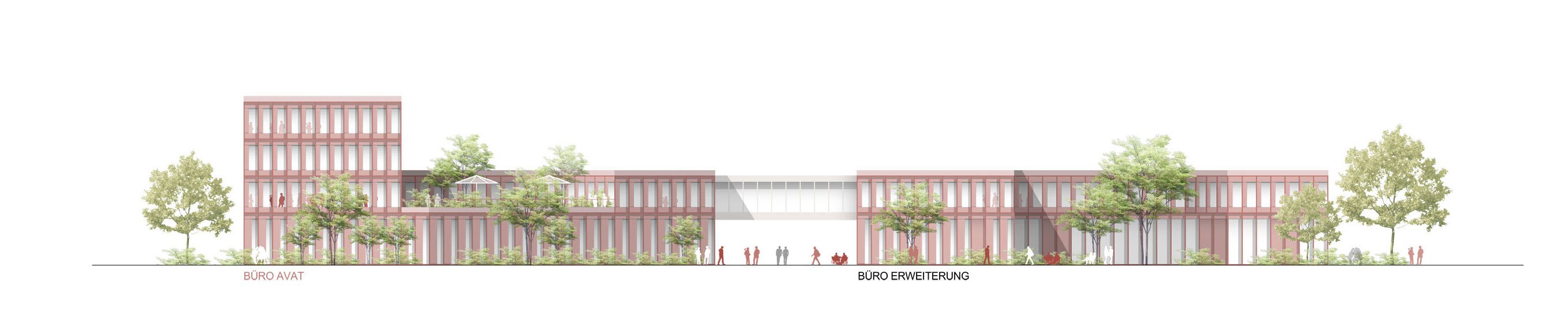 Konstruktiv setzt der Entwurf auf ein hybrides Holztragwerk, das die räumliche Atmosphäre wesentlich prägt und eine nachhaltige Grundstruktur schafft. Die Gebäudehülle wird als technisch präzise Elementfassade aus Aluminium entwickelt, deren rhythmische Gliederung dem Ensemble einen klaren Ausdruck verleiht. Die markante rötliche Pulverbeschichtung greift die Identität von AVAT auf und macht sie im Stadtbild sichtbar, während vertikale Lamellen konstruktiv den Sonnenschutz übernehmen.