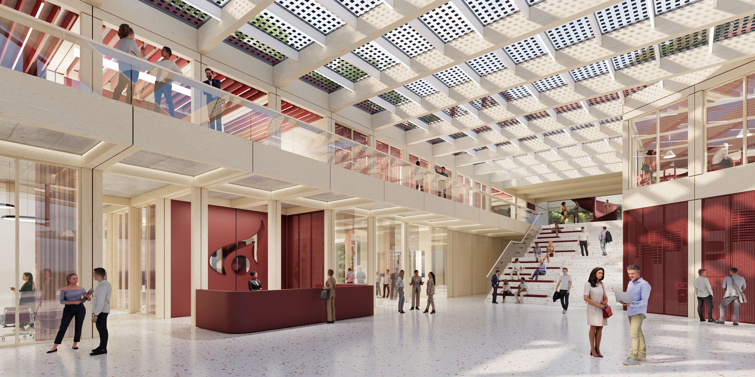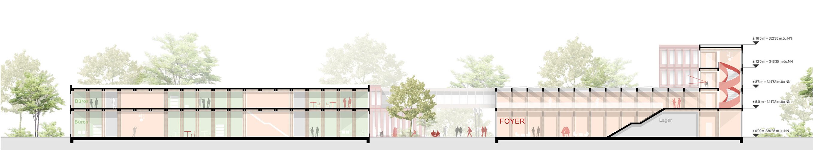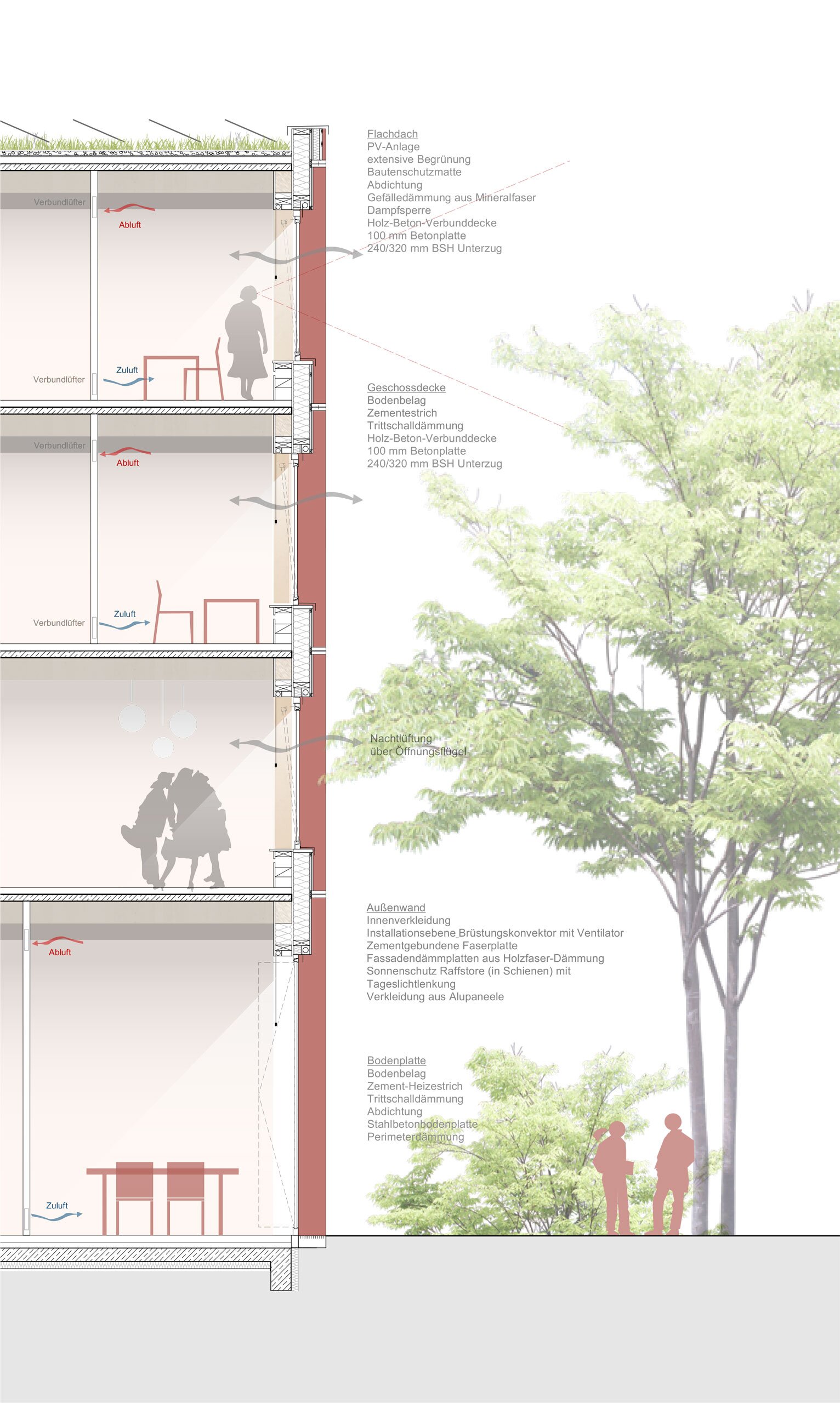 Konstruktiv setzt der Entwurf auf ein hybrides Holztragwerk, das die räumliche Atmosphäre wesentlich prägt und eine nachhaltige Grundstruktur schafft. Die Gebäudehülle wird als technisch präzise Elementfassade aus Aluminium entwickelt, deren rhythmische Gliederung dem Ensemble einen klaren Ausdruck verleiht. Die markante rötliche Pulverbeschichtung greift die Identität von AVAT auf und macht sie im Stadtbild sichtbar, während vertikale Lamellen konstruktiv den Sonnenschutz übernehmen.