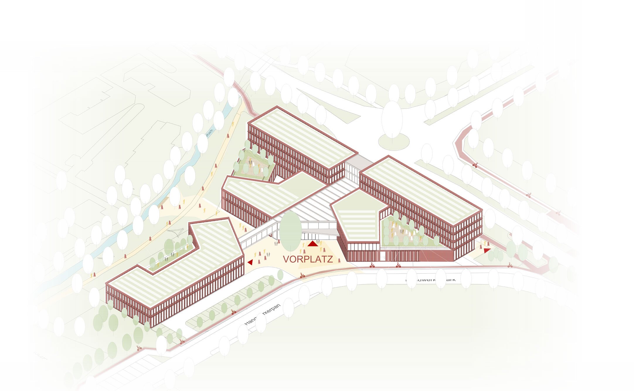 Unser Entwurf formt drei Baukörper zu einem offenen Gebäudeensemble, das im Erdgeschoss über ein gemeinsames Foyer zusammengeführt wird. Die präzise Setzung zur Herrenberger Straße stärkt die Adressbildung am westlichen Stadteingang Tübingens, während sich das Ensemble zum angrenzenden Handwerkerpark mit Grün- und Aufenthaltsbereichen öffnet. Zwischen den Baukörpern entsteht ein zentraler Gartenhof, der als ruhiger Innenbereich Orientierung, Licht und Aufenthaltsqualität schafft.